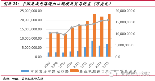 國內(nèi)需求充足,進口替代空間巨大。中國集成電路市場規(guī)模雖然大,但不可回避的問題是其自給率偏低。據(jù)海關(guān)統(tǒng)計,2015 年中國集成電路進口金額比去年同期增長6%,達到2307億美元,而出口金額為僅為693.1億美元,進出口逆差仍然有1613.9億美元,這表明國內(nèi)有極大的進口替代空間。