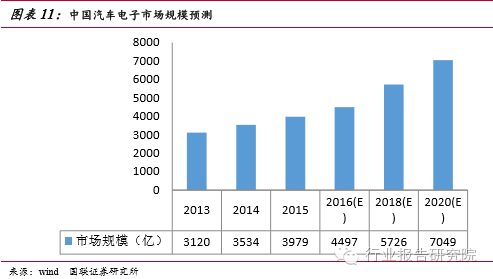 汽車電子類產(chǎn)品通常落后消費類電子產(chǎn)品一個時期,正如過去幾年手機行業(yè)所經(jīng)歷的那樣,汽車業(yè)正在由“功能機”向“智能機”發(fā)展,這將給電子行業(yè)帶來新的增長引擎。受惠于各國汽車安全政策加持,近期汽車電子輔助行車安全的趨勢已十分明確,越來越多類似TPMS、倒車影像、自動剎車系統(tǒng)等新應(yīng)用崛起。各大車企、互聯(lián)網(wǎng)公司紛紛加快在車聯(lián)網(wǎng)和自動駕駛領(lǐng)域的產(chǎn)業(yè)布局,車聯(lián)網(wǎng)有望成為第一個實現(xiàn)的物聯(lián)網(wǎng)應(yīng)用空間廣闊,存量與增量汽車市場規(guī)??捎^。2015 年中國汽車電子市場規(guī)模為3,979億元,同比增長12.6%,2013~2015年中國汽車電子市場規(guī)模平均增長率為13.7% 。中商產(chǎn)業(yè)研究院預(yù)測2016年中國汽車電子市場規(guī)模為4497億元。賽迪顧問預(yù)計到2016年中國汽車電子市場將保持 10%以上的增速,同時汽車電子在整車成本中的占比將超過50% 。我們判斷中國汽車電子市場增長方式正在由汽車產(chǎn)量增長轉(zhuǎn)向功能需求驅(qū)動。
