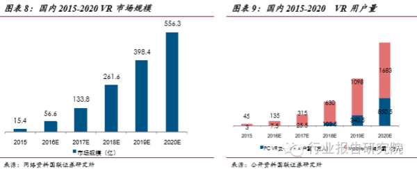 下一代計算平臺,顛覆眾多傳統(tǒng)領(lǐng)域。預(yù)計2016年國內(nèi)VR市場增長了近四倍, 之后的增速雖然有所減緩,但是市場的規(guī)模成倍增加。到2020年,市場規(guī)??梢赃_到556億元,用戶量達到2500萬,其中PC端用戶量將會突破850萬人,移動端將會達到1683萬人,出貨量達到820萬臺,其中PCVR一體機的出貨量170 萬臺,移動VR出貨量750萬臺,移動端的VR市場爆發(fā)的更加的迅速,市場潛力更大。
