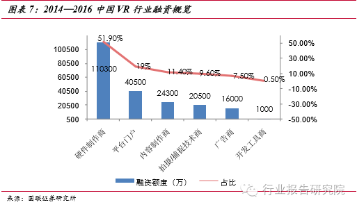 蓄勢待發(fā),爆發(fā)潛能驚人。VR 硬件包括輸出設(shè)備如 PC 端顯示頭戴,移動端顯 示頭戴,以及輸入設(shè)備如手柄,跑步機,動作捕捉識別設(shè)備,全景相機等。國內(nèi)目前融資最大的一塊就是硬件制作商,占比達到 51.9%,這也說明了國內(nèi)的 VR市場還處在初期,國外的VR已經(jīng)形成了產(chǎn)業(yè)化,國內(nèi)的市場雖然處于初期但是成長的潛力確實非常大的。