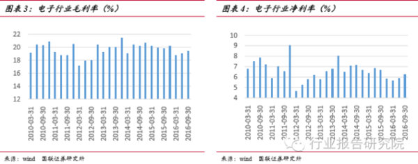 本文將電子行業(yè)按照申萬的行業(yè)分類,分為半導(dǎo)體、元件、光學(xué)光電子、電子制 造和其他電子五個子版塊。16 年前三季度,電子行業(yè)實現(xiàn)營收合計4067.24 億元,同比增長 25.71%;實現(xiàn)歸母凈利潤 254.78 億元,同比增長 22.13%。產(chǎn)業(yè)營收規(guī)模再次創(chuàng)出行業(yè)同期新高,產(chǎn)值和利潤規(guī)模均出現(xiàn)環(huán)比上升的勢頭,整體向好趨勢顯著。